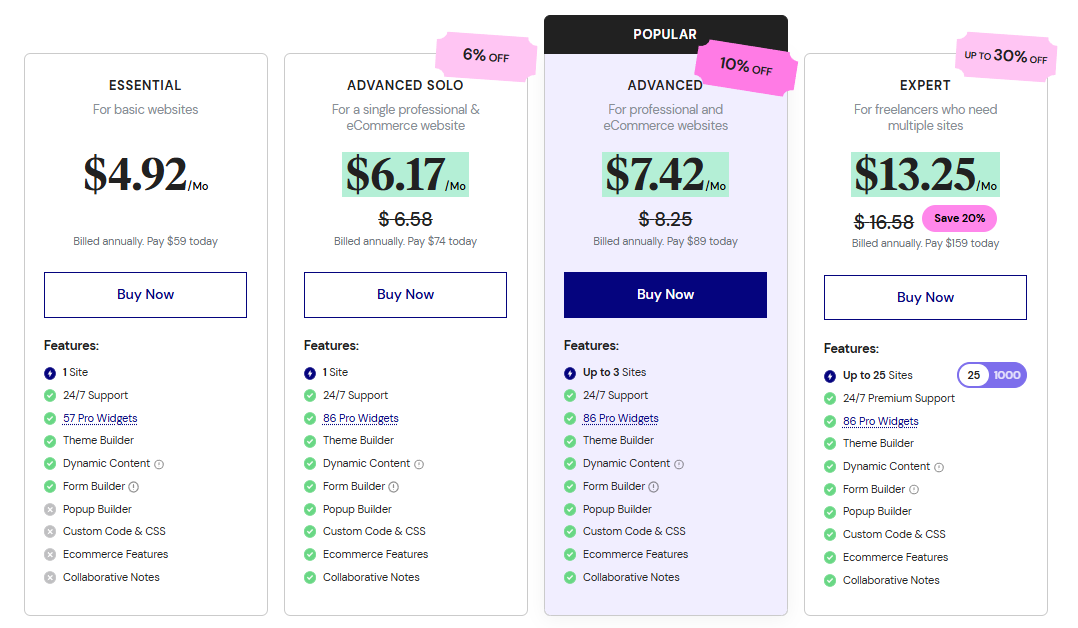 Elementorには、大きくわけるとエッセンシャルプラン(基本プラン)とアドバンスプラン(上級プラン)があります。アドバンスプランは使えるサイトの数の違いで、一番最上位のエキスパートプランであってもサイトの数以外はそれほど内容に違いはありません。