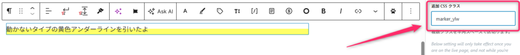 追加したい文章や文章の一部に「marker_anime」を追加します。これによる動かすバージョンと動かさないバージョンで使い分けることができます。