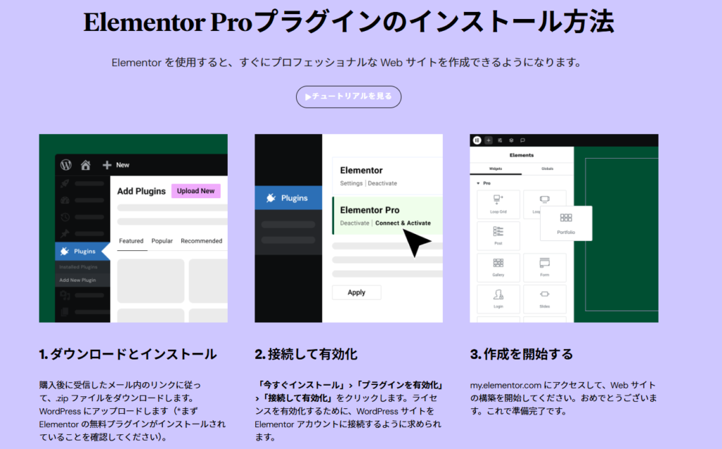 プロ版のプラグインのダウンロードはElementorアカウントページでも可能です。インストール方法はサンキューページにも書かれていますし、購入時のメールにも説明があります。